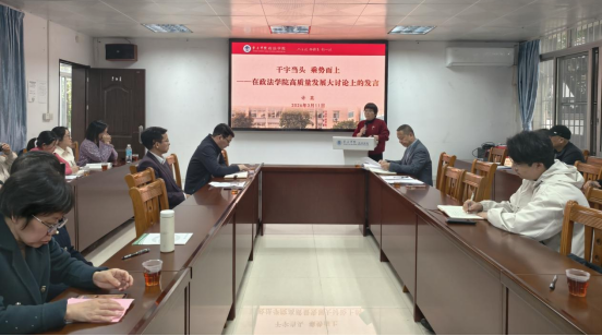 在交流研讨环节,四位教师代表结合教学科研实际积极建言献策。韩荣老师提出,要以数智赋能提升教学质量,强化升学就业助力计划,完善竞赛培育机制,多措并举推动学院高质量发展。王超杰老师建议,聚焦法科生法律文书写作能力与实践素养培养,夯实专业根基,强化写作训练,在持续积累中提升学生专业能力。张海玲老师提出,以“数字治理”内涵建设为契机,将数字化课程融入教学体系,开设“公务员能力与素养”微专业,推动人才培养模式创新,并鼓励学生深入基层治理一线开展论文研究,助力行政管理专业在高质量发展背景下实现突破。李莹老师则聚焦公务员素养与职业能力微专业建设,提出深化科教融合、产教协同,推动专业发展与地方治理服务双向赋能。