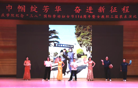 比赛中,学院七位女教师分为两组登场。旗袍组步履从容、温婉雅致,尽显东方女性的独特韵味;运动装组步伐轻快、活力满满,展现新时代女性蓬勃向上的精神风貌。两组表演衔接流畅、配合默契,舞台大屏同步播放的学院女教职工工作生活影像,更生动呈现了政法巾帼在教书育人、科研管理及日常生活中的多元风采。